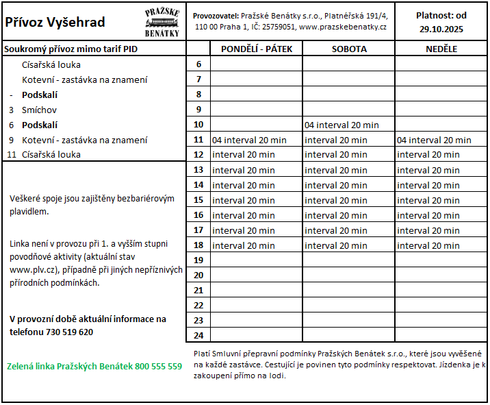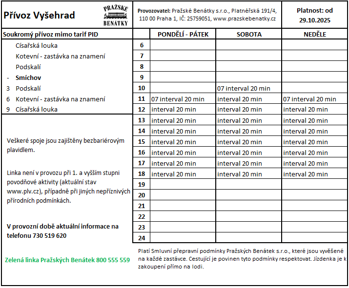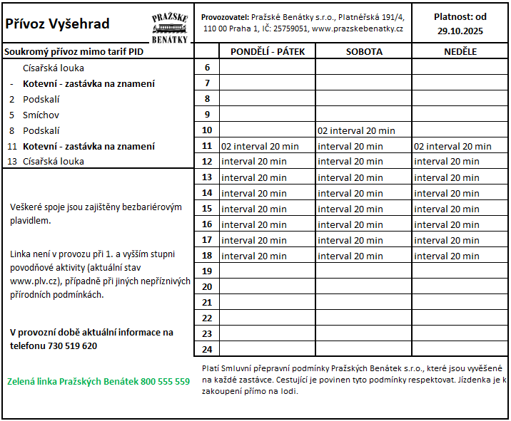 Na trase přívozu platí přepravní podmínky společnosti Pražské Benátky s. r. o., které jsou vyvěšeny na každé zastávce.