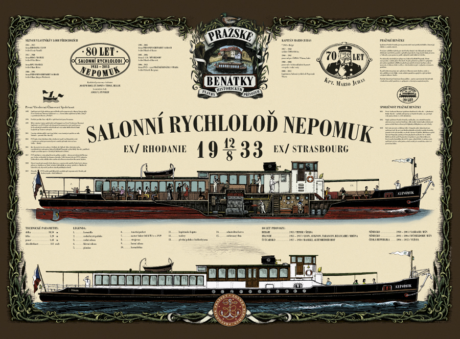 Unsere Schifffahrtsgesellschaft ist der Brotherr für zirka drei Dutzend Mitarbeiter verschiedener Glaubenbekenntnisse, Hautfarben und Nationalitäten. Die Compagnie wurde A.D.1933 vom Herrn Zdeněk Bergman, einfachen Prager Fährmann, als die Erste Allgemeine Schifffahrtsgesellschaft gegründet. Nachdem dieser sein wasserwissenschaftliches Studium beendet hatte, nahm er sich vor, eine Gesellschaft aufzubauen und gleichzeitig seinen Traum zu verwirklichen: sich dem Schiffsmetier zu widmen und, das alte Prag liebend, möglichst viele Menschen damit bekannt zu machen, was er selbst für schön und wertvoll hält.